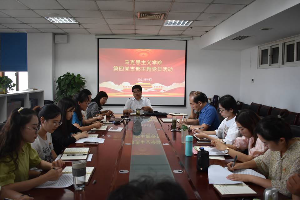 2021年9月16日下午,马克思主义学院第四党支部以“青年教师秉初心,铸魂育人担使命”主题,围绕青年教师的成长和发展,组织开展主题党日活动。校党委副书记单连岱参加并指导。主题党日活动由第四党支部书记秦秋主持,学院班子成员和第四党支部全体党员教师参加。