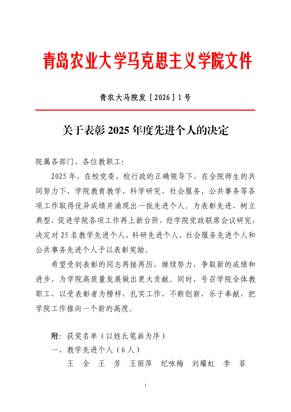 关于表彰2025年度先进个人的决定